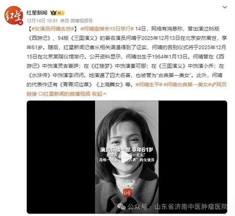 2025年12月13-14日,“女演员何晴离世”新闻登顶热搜,瞬间引起轰动。这位曾饰演《西游记》怜怜、《红楼梦》秦可卿、《三国演义》小乔和《水浒传》李师师的中国内地唯一演遍四大名著的女演员,在与脑瘤抗争近十年后,终因病情复发离世,年仅61岁。